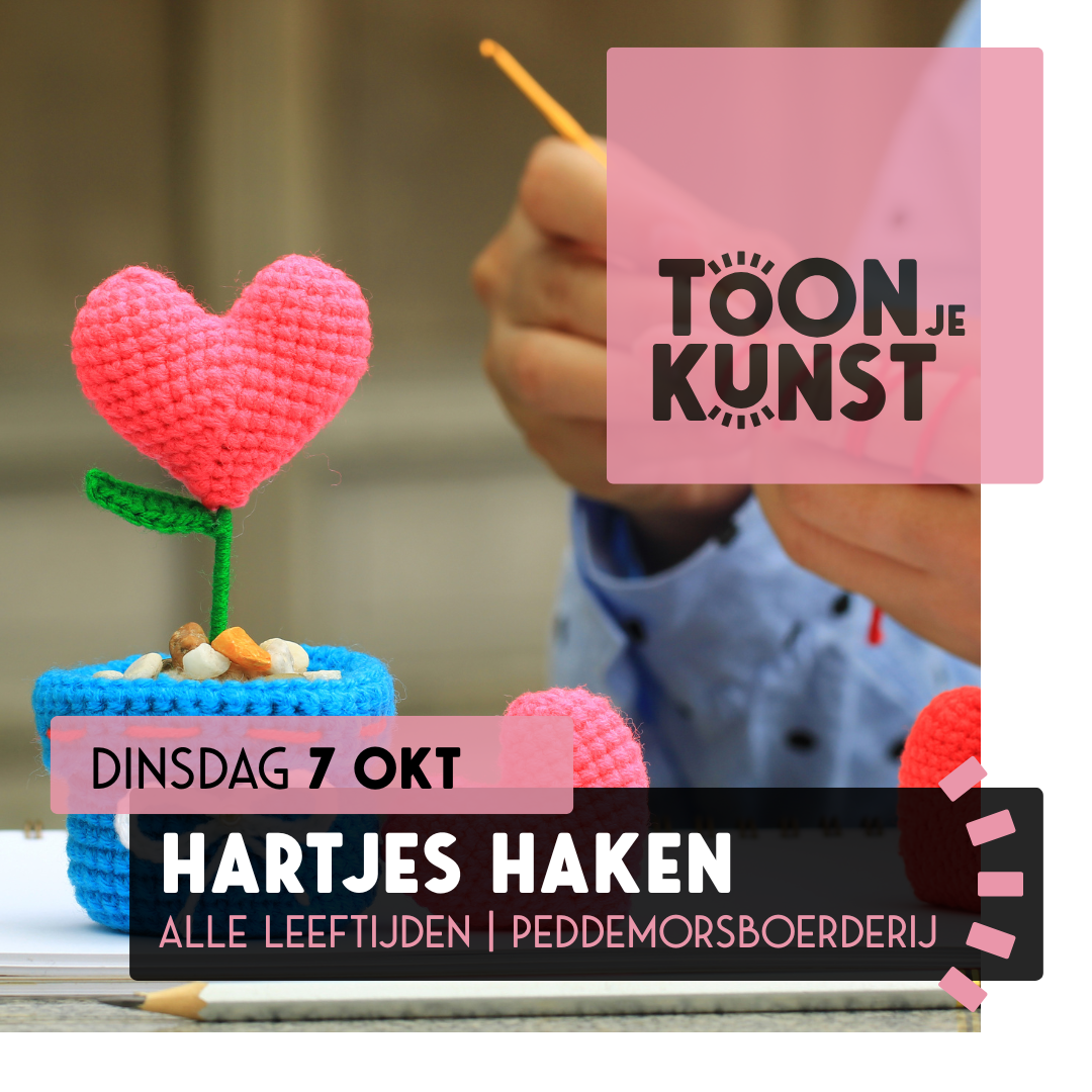 Op dinsdag 7 oktober om 13.00 uur en om 15.00 uur wordt er een workshop Hartjes Haken door Leni Zomer van Crehaaksies georganiseerd voor alle leeftijden. De deelname is gratis, maar wel even opgeven via info@peddemorsboerderij.nl