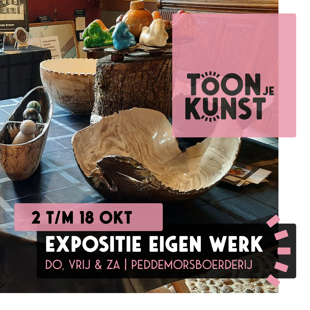 De kunstenaars krijgen ieder een plek in de boerderij toegewezen en samen met de commissie ‘Eigen Werk’ van de Peddemorsboerderij wordt deze expositie dan ingericht. Er is dan ook een grote verscheidenheid aan kunstuitingen te zien, o.a. schilderen, olie en of acryl, creatief houtbewerking, fotografie, vilterij, tekeningen, steenbewerken, glasfusing, wolbewerken, kleibewerken, etc.