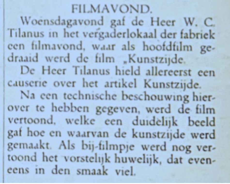 En filmavonden waren er ook in 1938 zoals een berichtje in de Vriezenveense Courant te lezen was. Daarin staat dat de heer W.C. Tilanus in het vergaderlokaal der fabriek een filmavond heeft gehouden en de hoofdfilm “kunstzijde” gedraaid werd. De heer Tilanus hield daarbij voorafgaand nog een “causerie”. En er werd een “bij-filmpje gedraaid van een trouwerij ter afsluiting. Dit alles is nu niet aan de orde maar wel leuk om te weten dat filmavonden ook toen al werden georganiseerd. En dan kijken we uit naar de “causerie” die op deze avonden wordt gehouden.